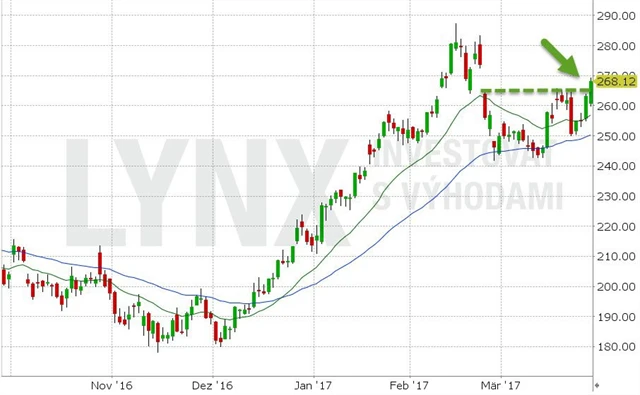 Vstup do nákupní pozice volíme limitním příkazem na 268 USD. Očekáváme, že titul nabere nákupní momentum, rychle překoná poslední maxima a nabídne další solidní růst. Stop-loss je v tomto případě důležité skálopevně držet pod minimem z posledního týdne.
