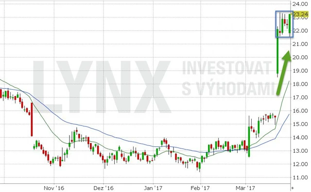 Pozitivní kvartální výsledky nedávno vyšvihly cenu prudce nahoru a akcie přidaly 40 % během pár dnů. Aktuálně cena konsoliduje v úzkém pásmu a z technického hlediska tvoří býčí vlajku. Taková formace nabízí dobré vstupní pravděpodobnosti případného proražení výše.