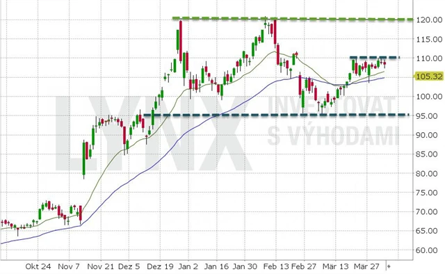 Pro vstup do nákupní pozice volíme proražení rezistence na 110 USD, přičemž očekáváme, že titul chytí nákupní momentum a nabídne rychlý zisk minimálně k oblasti aktuálního maxima. Spekulujeme nicméně na dlouhodobější růst až ke 145 USD.