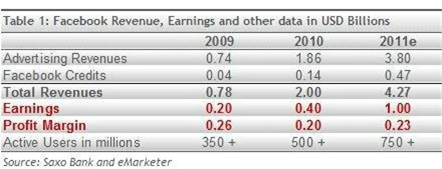 Podle eMarketeru vzrostly reklamní příjmy Facebooku ze 2 miliard USD v roce 2010 na 4 miliardy v roce 2011, přičemž 89 % těchto příjmů pochází čistě z reklamy a zbytek z kreditů na Facebooku. Jak je vidět v první tabulce, kredity na Facebooku rostou velice rychle. Konkurenční Google a Yahoo! si mohou o podobných příjmech z tradiční reklamy nechat zdát.