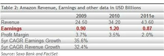 Ve druhé tabulce je uveden zisk a obrat Amazonu. Zatímco společnost výrazně roste, vykazuje nízkou ziskovou marži a ukazatel PEG (P/E k růstu) je 3,4 (Facebook má ukazatel PEG na hodnotě 1,5).