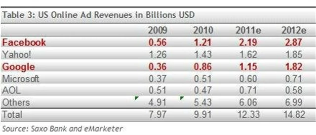 Pokud investoři pochybují o růstu online reklamy na Facebooku, poslední dvě tabulky zobrazují silnou míru růstu reklamních příjmů Facebooku. Na Facebook připadlo 12 % celkových online reklamních příjmů v Americe za rok 2010.