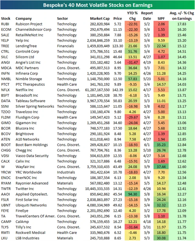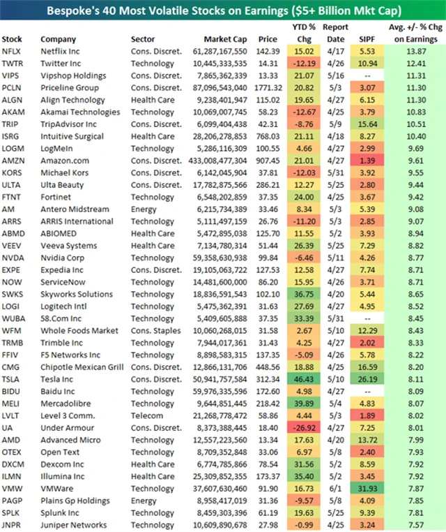 40 akcií firem s kapitalizací nad 5 miliard USD s největším pohybem ceny ve "výsledkový den"
