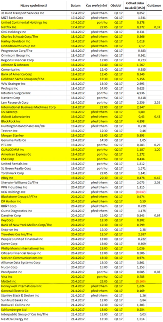 Které světové firmy představí výsledky hospodaření za uplynulý kvartál v týdnu od 17. dubna a jaké zisky v rámci indexu S&P 500 a od jednotlivých společností očekávají analytici oslovení agenturami Thomson Reuters a Bloomberg? (14. 4. 2017)