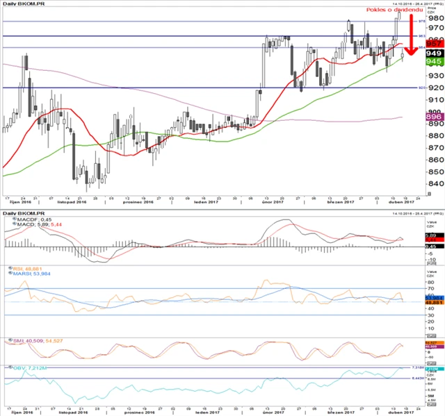 V předdividendovém opojení vystoupala cena nad 983. Následný propad právě o výši dividendy komplikuje technickou analýzu, jelikož indikátory se nyní jeví jako přeprodané. Propad o dividendu stanovuje novou hranici, podle které se mohou investoři orientovat. Komerční banka zahájila ve čtvrtek obchodování na 946. V současnosti toho nelze k technickým indikátorům mnoho říci. Na základě klouzavých průměrů lze alespoň konstatovat, že mají růstovou tendenci a i po propadu ceny se titul nachází nad 50denním průměrem. Z tohoto omezeného pohledu je sentiment okolo akcií KB pozitivní.