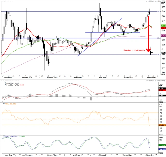 Prakticky totožná situace jako u KB. Také MONETA se již obchoduje bez nároku na dividendu. Cena se propadla na 79,90. To je v tuto chvíli podpora, podle které se mohou investoři orientovat. Současný vývoj napovídá mírnému posilování nad tuto úroveň.