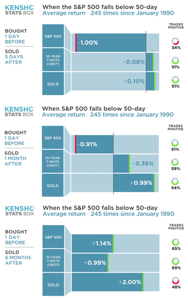 Není od věci připomenout, že před Velikonocemi index S&P 500 klesl pod svůj 50denní klouzavý průměr. Jak se americkým akciím od roku 1990 (bezmála 250 případů) v takovém případě (ne)dařilo další den, měsíc a půlrok?