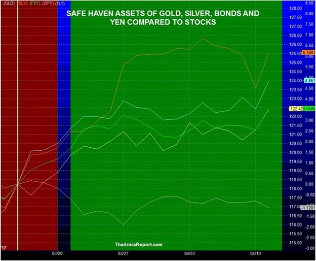 Nigam Arora, autor pravidelného Arora Reportu a sloupkař v mnoha finančních periodicích, nyní bezpečným přístavům příliš nevěří. Zlato, stříbro, dluhopisy nebo japonský jen jsou na tom v poslední době lépe než akcie (což je patrné z grafu). Mohou za to především situace v Sýrii, "neposlušná" Severní Korea, nejistota okolo voleb ve Francii a další faktory.