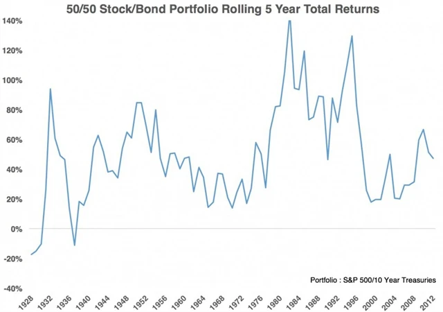 Nejdříve ale trochu historie. Z pohledu na graf níže je patrné, že portfolio složené napůl z akcií a z dluhopisů zaznamenalo v pětiletém horizontu negativní výnos (jde o takzvané total return výnosy, tedy včetně dividend) pouze na začátku a v polovině 30. let, kdy se USA zmítaly ve Velké depresi. V té době akciový trh (reprezentovaný indexem S&P 500) klesl o 80 % a dluhopisy nedokázaly tuto ztrátu napravit.