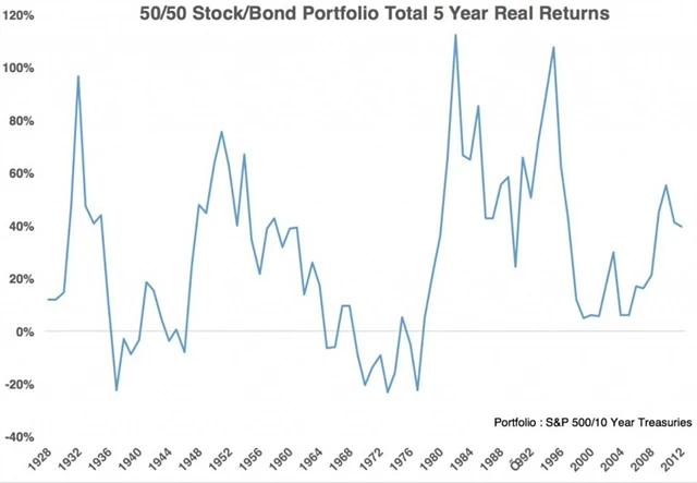 Jinak se ale tomuto portfoliu vedlo až překvapivě dobře, i když cykly na grafu patrné samozřejmě jsou. Celkově za posledních 80 let portfolio z akcií a dluhopisů dokázalo v pětiletém horizontu vydělávat. Je to možná i díky tomu, že od roku 1928 se stalo pouze třikrát, aby v jeden kalendářní rok ztrácely současně akcie i dluhopisy.