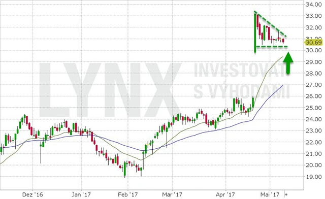 Po výrazném pohybu vzhůru se cena mírně stahuje níže a vytváří formaci trojúhelníku. Nakupující ale drží cenu stále nad supportem zhruba na 30 USD. Technicky vzato jde o velice zajímavé nastavení pro trendový obchod.