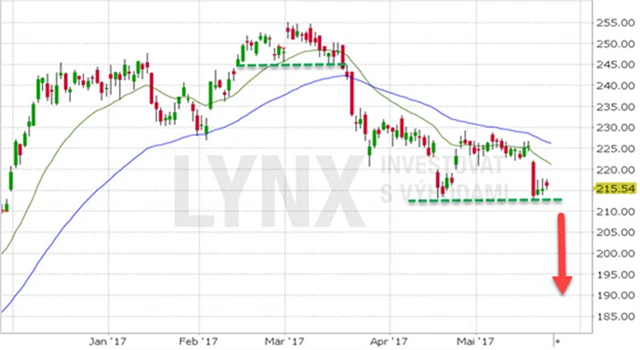 Pro vstup do SHORT pozice potřebujeme cenu pod 213,80 USD, bezpečněji až pod 213 USD. Spekulujeme na razantnější proražení, cena by se v takovém případě neměla vracet nad 220,50 USD, kam umísťujeme stop-loss. Míříme až na 190 USD. V případě, že cena nejdříve vyroste nad 220 USD, považujeme to za negaci svého scénáře a do obchodu nevstupujeme.