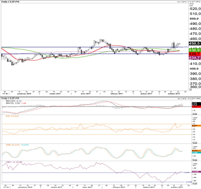 ČEZ, Komerční banka a MONETA Money Bank: České blue chips pohledem technické analýzy (24. 5. 2017)