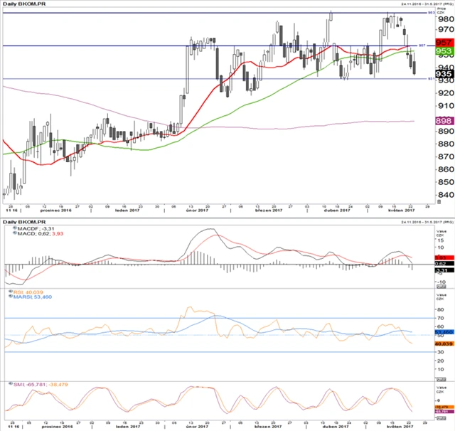 Proražení pod 957 bylo ještě hladší, než jsme očekávali. Nejbližší a dobře otestovaná podpora je na 931. Nepříznivě vyhlíží MACD, která sestoupila pod svou signální linii, zvětšuje odstup a míří do záporného pásma. Ale RSI již propad zpomaluje. SMI sice tyto známky ještě nejeví, ale je již na úrovni, ze které v minulosti začínal růst. Otestovaná hranice podpory na 931 by měla zafungovat, a tak očekáváme zotavení titulu.