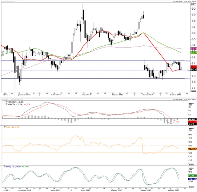 Podpora na 79,9 zatím drží. Technické signály však nejsou zrovna optimistické. Začněme u SMI. Ten má k minimu ještě celkem daleko, takže nic dobrého. Spíše neutrálně se jeví RSI, který je stabilní okolo 40. Pozitivně se naopak jeví MACD, která kříží signální linii v záporném pásmu. V posledních dvou měsících však nebyl tento indikátor zrovna spolehlivý. Očekáváme spíše proražení podpory 79,9 a pokles pod ni.