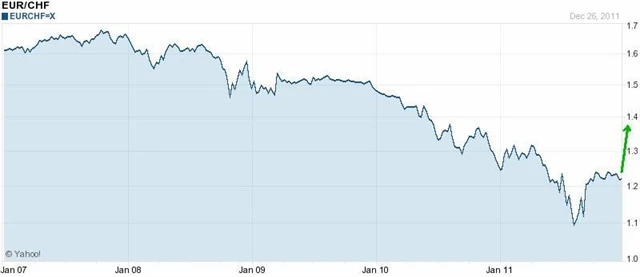 Švýcarský frank oslabí vůči euro o zhruba 14 %. Švýcarská národní banka totiž přistoupí k ještě agresivnějším krokům v zájmu podpory švýcarského exportu, tedy oslabení franku.