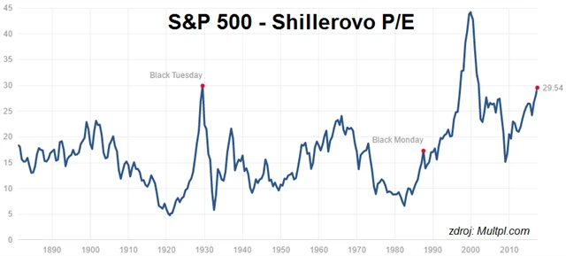 Podle Shillera je sice růst cen o polovinu nepravděpodobný, ale možný. Cyklicky očištěné P/E amerických akcií (takzvané Shillerovo P/E neboli CAPE) by zkrátka jen ze současných zhruba 30 bodů vzrostlo na 45 (při zachování aktuální ziskovosti firem), tedy na úroveň z konce 90. let. Podle profesora je to prý pravděpodobnější, než že ceny akcií spadnou o 50 %.