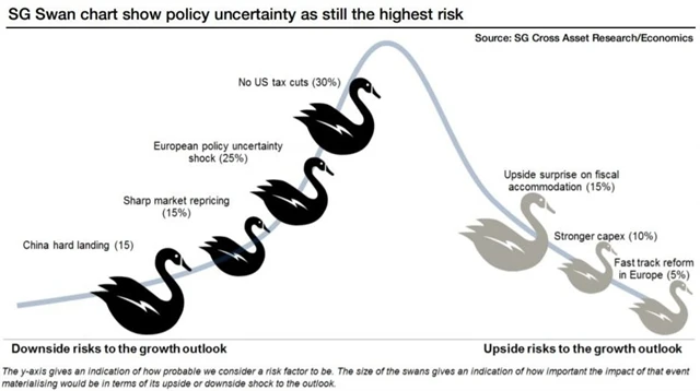 Není od věci k tomu poznamenat, že myšlenka snižování daní americkým firmám po delší době zahýbala i s jedním velice sledovaným grafem. Jde o přehled potenciálních černých labutí, který sestavují analytici ze Société Générale. Právě neuskutečnění již v hrubých obrysech navržené daňové reformy aktuálně považují za největší možnou zlomovou událost pro trhy.