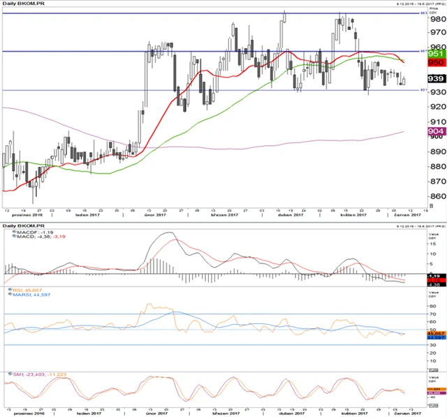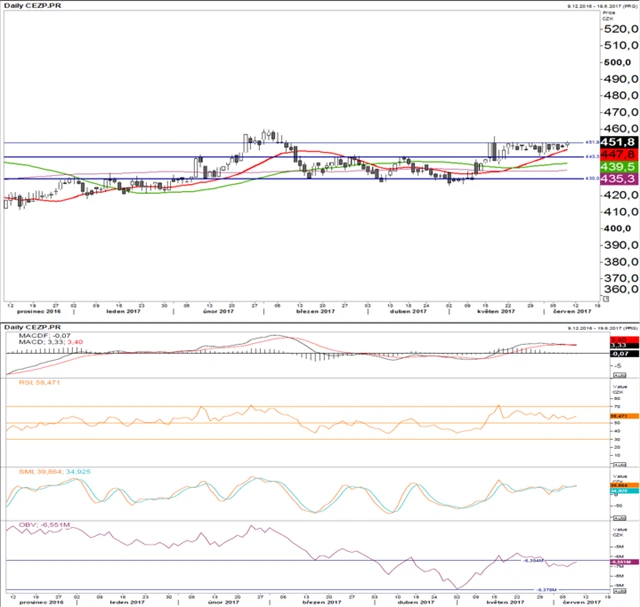 Negativní prognózy propadu pod 443 se nenaplnily. Místo toho akcie ČEZ celkem bezpečně poskakují mezi podporou na 443 a rezistencí na 452. To je poměrně úzké pásmo. Akcie neměly ambici se nikam posunout i kvůli nízkému objemu obchodů v posledních dnech. Technické indikátory jsou poměrně mdlé, nasvědčují spíše vyčkávání investorů na valnou hromadu, která se uskuteční 21. června. Na té se bude rozhodovat o dividendě (návrh 33 Kč na akcii; 26. června se bude obchodovat již bez nároku na dividendu, očekávejme tedy technickou korekci).