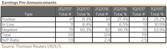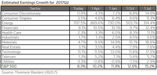 Jak se vyvíjejí odhady růstu či poklesu zisků za 2Q2017?