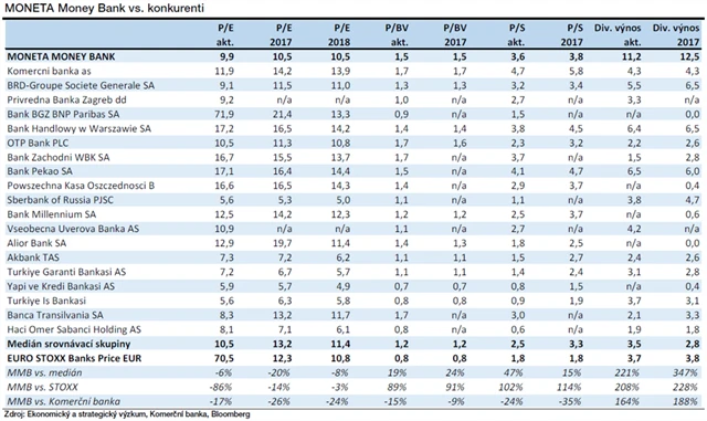 Oproti srovnávací skupině vybraných bankovních domů se akcie Monety obchodují s prémií, což podle Komerční banky reflektuje podstatně vyšší dividendový výnos. Ten si MONETA Money Bank může dovolit díky jedné z nejvyšších rentabilit mezi bankami, silné kapitálové pozici a nezávislosti na externím financování. "Prémii v současnosti nepovažujeme za příliš vysokou, a proto hodnotíme stávající ocenění akcií Monety vůči konkurentům neutrálně," napsali analytici z Komerční banky.