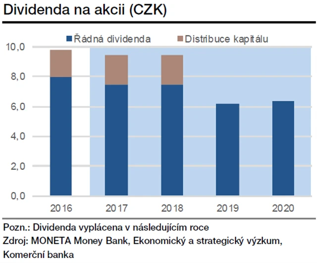 Ve své aktuální analýze předpokládá, že MONETA vyplatí z přebytečného kapitálu v následujících dvou letech další 2 miliardy Kč. Očekává zároveň výplatu celého čistého zisku z letošního a příštího roku, dlouhodobě pak očekává výplatní poměr na úrovni 80 %. Dividendový výnos tak dosahuje 12 %, což výrazně převyšuje průměr sektoru.