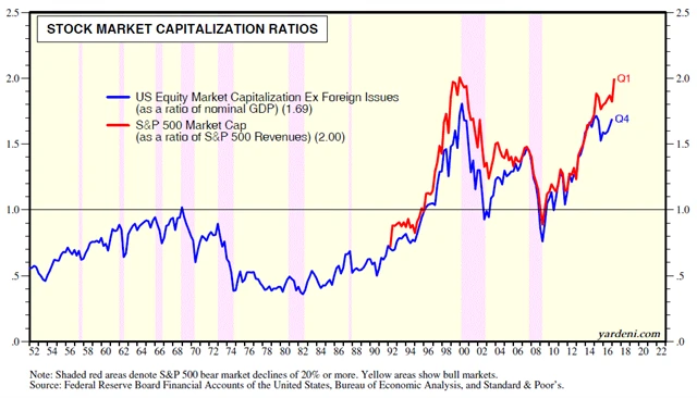 Prvními dvěma jsou valuační ukazatele. Tržní kapitalizace akciového indexu S&P 500 s vyloučením cenných papírů zahraničních podniků v poměru k nominálnímu HDP Spojených států dosahovala v prvním čtvrtletí 2000, na vrcholu technologické bubliny, úrovně 1,81. Na konci loňského roku se ukazatel dostal na 1,69. A tržní kapizaliazce S&P 500 v poměru k agregovaným tržbám firem z tohoto indexu v letošním prvním čtvrtletí vyrovnala svou rekordní hodnotu 2,00 z posledního čtvrtletí 1999. Oba ukazatele přitom silně korelují s vývojem S&P 500.
