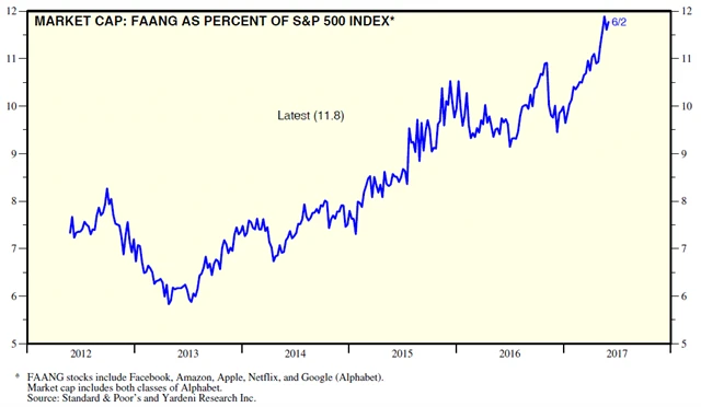 Tržní kapitalizace Facebooku, Amazonu, Applu, Alphabetu a Netflixu se ke konci dubna meziročně zvýšila o více než 40 % na rekordní úroveň 2,5 bilionu dolarů, zatímco tržní kapitalizace celého indexu S&P 500 stoupla "jen" o 14,3 % na 20,95 bilionu dolarů. Pětice zmíněných technologických firem se tak zasloužila o 27,8 % hodnoty, o kterou vzrostla market cap S&P 500, a nyní tvoří zhruba 12 % tržní kapitalizace tohoto benchmarku.