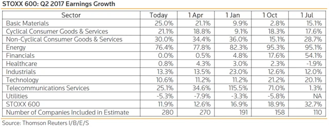 Jak se vyvíjejí odhady růstu či poklesu zisků evropských firem za 2Q2017?