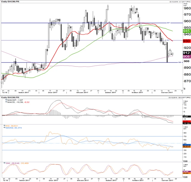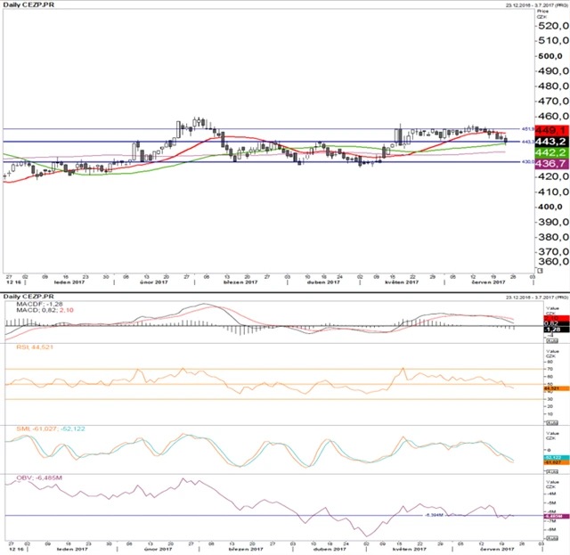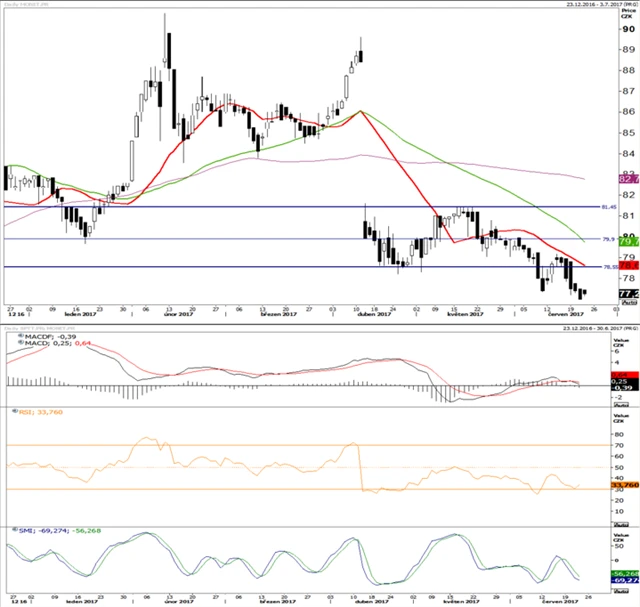 Cena se vyvíjí v souladu s prognózou, osciluje mezi 452 a 443. Byla schválena dividenda 33 Kč na akcii, první den bez nároku na ni je 26. června, lze tedy očekávat technickou korekci (očištěno o daň 28,05 Kč). Technické indikátory vyznívají spíše negativně. Platí to o MACD i RSI. Lepší zítřky slibuje pouze SMI, který se blíží k minimu. Korekce o dividendu zkraje příštího týdne dočasně omezí vypovídací schopnost technické analýzy.