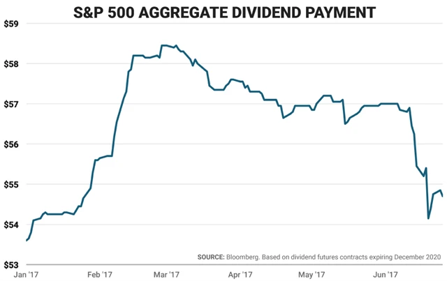 Dividendy vyplácené firmami z indexu S&P 500 budou zřejmě nižší, než se čekalo. Předpokládaná výplata na jednu akcii indexu klesla od začátku března o zhruba 6 % na necelých 55 USD. Údaj je založený na futures kontraktech s expirací na konci roku 2020.