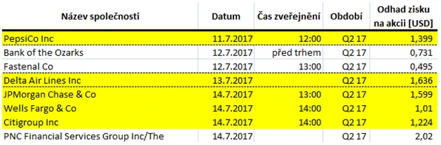 Které světové firmy představí výsledky hospodaření za uplynulý kvartál v týdnu od 10. července a jaké zisky v rámci indexu S&P 500 a od jednotlivých společností očekávají analytici oslovení agenturami Thomson Reuters a Bloomberg? (7. 7. 2017)