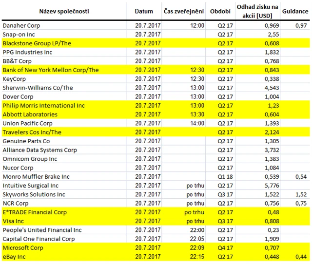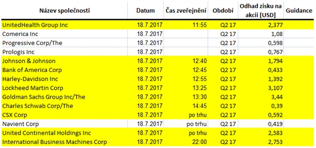 Které světové firmy představí výsledky hospodaření za uplynulý kvartál v týdnu od 17. července a jaké zisky v rámci indexu S&P 500 a od jednotlivých společností očekávají analytici oslovení agenturami Thomson Reuters a Bloomberg? (14. 7. 2017)