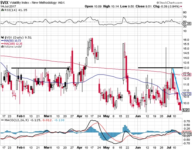 Index volatility VIX během růstu cen akcií klesl pod 10 bodů a je na mimořádně nízké úrovni. Prakticky jakákoli hodnota pod 13 bude nadále vnímána jako pozitivní signál pro americké akcie. Ale pozor, k 13 bodům to má index přes 30 % daleko, a růst o několik desítek procent by znamenal výrazný nárůst nervozity.