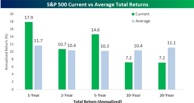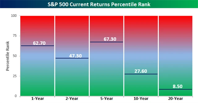 Přestože za poslední rok posílily americké akcie o zhruba 18 %, tento výsledek je pouze v 62. percentilu historických ročních skóre. Nejlépe je na tom současný pětiletý horizont, v němž akcie zpevnily o 14,6 % ročně (67. percentil). Dvouletý, desetiletý a dvacetiletý investiční horizont jsou na tom historicky velice slabě, ve dvacetiletém horizontu se dokonce nevyskytlo mnoho období, ve kterých by americké akcie zaznamenaly horší výsledky než za posledních 20 let.