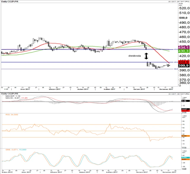 Stále se nic nemění. Pásmo 392-407 bylo potvrzeno, přesněji řečeno se spíše zužuje směrem dolů s psychologickou rezistencí na 400. Samotné technické indikátory jsou po uplynutí termínu pro právo na dividendu stále vychýlené, jejich náprava potrvá. Jeví se jako nepravděpodobné, že by se titul posunul mimo zmíněné rozpětí. Změna by mohla nastat až s oznámením hospodářských výsledků za druhý kvartál (8. srpna).