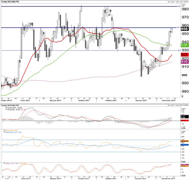 Růst ceny pokračuje. V současnosti se nachází na rezistenci (957) a pomalu se přesouvá do pásma překoupenosti. Zejména se jedná o indikátory RSI a SMI, které naznačují blížící se prodejní signál. MACD pokračuje v růstu, ale její odstup od signální linie se ustálil, což ukazuje na vyprchávající sílu růstového trendu. Klesá i objem obchodů. Pokud by růstový trend měl pokračovat až k 983, proražení rezistence by bylo doprovázeno zvýšeným objemem. To se však nyní neděje, a výraznější růst proto aktuálně neočekáváme. Hospodářské výsledky společnost zveřejní 2. srpna.