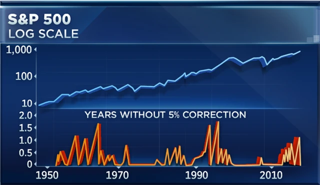 "Je to teprve pošesté od roku 1950, kdy široký americký akciový index déle než rok nezaznamenal pokles alespoň o 5 %. A současné období je nejdelší od roku 1995," upřesňuje Ryan Detrick ze společnosti LPL Financial.