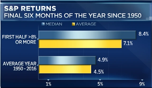 Ekonomický výhled je ale podle něj celkově příznivý a investoři by se neměli bát využívat případných poklesů k dokupování akciových pozic. A vedle solidního ziskového výhledu amerických firem to Detrick podporuje i historickými daty, podle kterých růsty o alespoň 8 % v prvním pololetí byla v 84 % kalendářních let následovány rally i ve zbytku roku, byť mírnější.