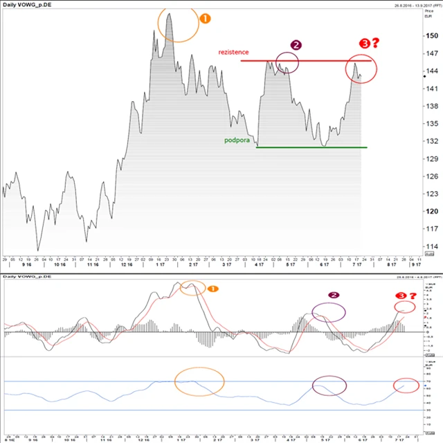 Indikátorů možného poklesu je více. Jednotlivá čísla ukazují prodejní signály na MACD a RSI. V prvních dvou případech následoval výprodej akcií Volkswagenu.