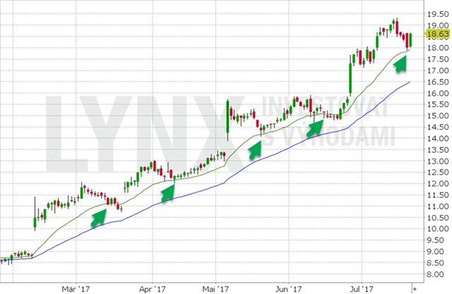 Po rychlejším nárůstu v posledních týdnech cena mírně koriguje a zastavuje se o rychlejší klouzavý průměr (zelená linie). Reakce nakupujících na tento plovoucí support je zřejmá, titul okamžitě otáčí, růst by tedy měl pokračovat.