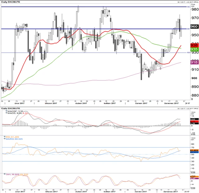 Vrchol rally byl o pár korun výše, než jsme čekali, technický dojem však zůstává stejný. Akcie se posouvají z pásma překoupenosti, a lze tedy očekávat tlak na cenu. Více než technické indikátory budou hrát v příštím týdnu (2. srpna) roli pololetní hospodářské výsledky společnosti. Samotná čísla bývají málokdy překvapením, a tak bude záležet zejména na komentáři banky ke kapitálové přiměřenosti. Do té doby očekáváme, že akcie budou spíše přešlapovat na místě. Poté je možné vše, jak jsme se přesvědčili téměř přesně před rokem. Tehdy byl management donucen snížit dividendu, načež se cena akcií propadla o 20 %.