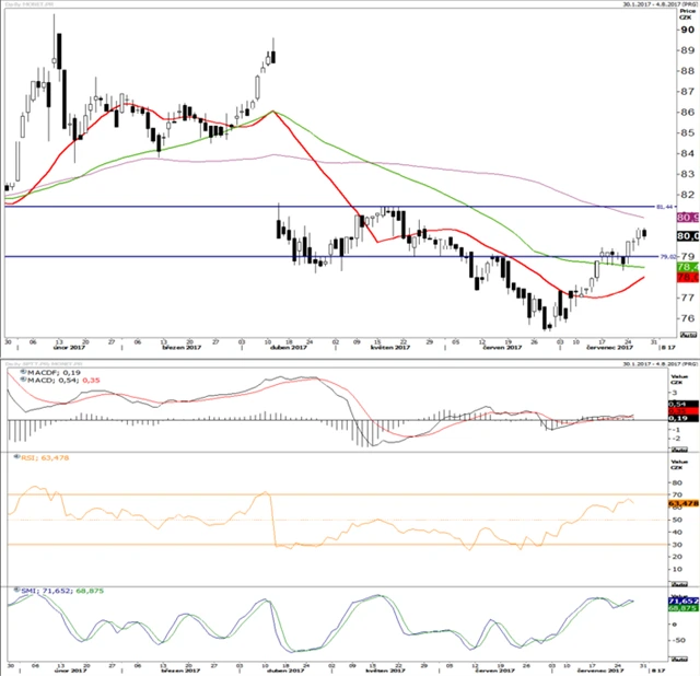 Akcie se drápou výše až k psychologické hranici 80, a to navzdory technickým indikátorům, které jsou poměrně vysoko. Řeč je zejména o RSI a SMI, které se ale ještě nenacházejí v pásmu překoupenosti. Prostor pro další růst je ale omezen, ačkoli jistý potenciál pro příští týden stále ještě je.