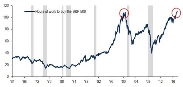 Nedávno banka zveřejnila graf, který by předpoklad jejích expertů ze začátku roku mohl potvrdit. Růst cen akcií vede k tomu, že pro průměrného amerického pracujícího jsou ve vztahu k jeho příjmům akcie rekordně drahé.