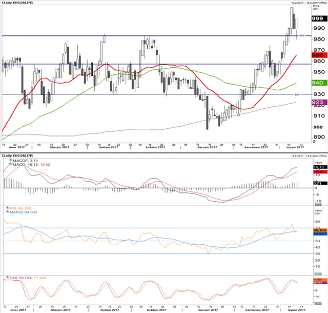 Akcie krátce zavítaly nad 1 000, kde se ale dlouho neohřály. Kulatou hladinu vnímáme jako rezistenci, nejbližší podpora se nachází na 983. Po nedávné rally by nebyl pokles pod uvedený support překvapením, šlo dlouhodobě o rezistenci pro cenu akcií. Technické indikátory poukazují na překoupenost, pro příští týden by i proto měly převládat protirůstové tendence.