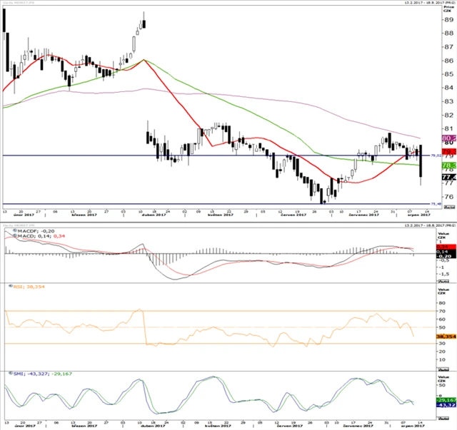Akcie se chvíli vezly na vlně solidních hospodářských výsledků, ale informace o další žalobě kvůli akvizici Agrobanky poslaly cenu do záporu. V takových případech je problematické hodnotit kurz z technického pohledu. Lze alespoň uvést, že nejbližší podpora je na 75,5.