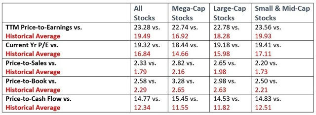 Z údajů společnosti VALIDEA, která sleduje ocenění akcií od roku 2005 pomocí několika ukazatelů, jako jsou P/E (TTM bere v potaz údaje za posledních dvanáct měsíců, Current Yr očekávané zisky v příštích 12 měsících), P/S (cena/tržby), P/B (cena/účetní hodnota), P/CF (cena/cash flow), vyplývá, že jsou dnes americké akcie drahé, ať je otočíte jakkoli.
