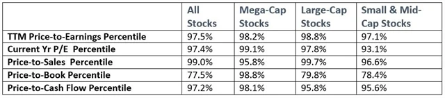 Další přehled ukazuje, ve kterém percentilu v rámci období od roku 2005 se nacházejí současné hodnoty zmiňovaných ukazatelů. Například hodnota P/S celého trhu je v 99. percentilu, což znamená, že pouze v jednom procentu času od roku 2005 byla hodnota vyšší než dnes. Vysoké hodnoty ve všech případech ukazují, že tak vysoká ocenění se v posledních letech skutečně nevyskytovala příliš často.