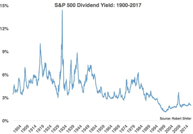 Jasnou veličinou je v této rovnici pouze dividenda. A z grafu níže je patrné, že v posledních letech dividendový výnos klesá. Dlouhodobý průměr činí něco kolem 4,2 %, nyní se pohybuje okolo 2 %. Znamená to, že by investoři měli od akcií očekávat nižší výnosy?