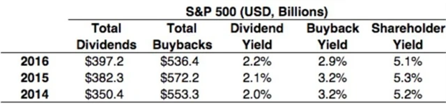 Když se sečtou výnosy z dividend a zpětných odkupů, dostáváme výsledek poněkud odlišný od případu, když jsou v úvahu brány pouze dividendy.